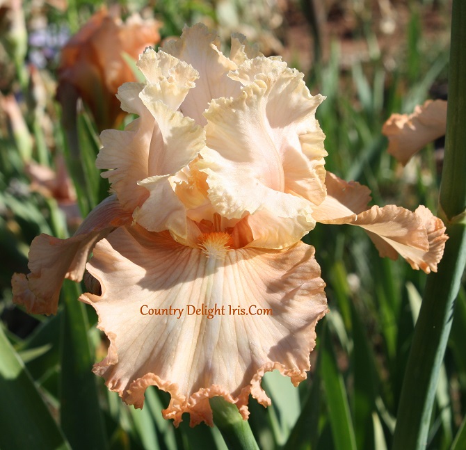 ‘Within Reach’ (Duane Meek, R. 2000) TB, 34″ (86 cm). Midseason bloom. Standards ivory, lightly flushed pink; style arms apricot; falls rose pink, lighter below beard, hafts blended tan; beards white, hairs tipped apricot to rose. D. & J. Gardens 2000.